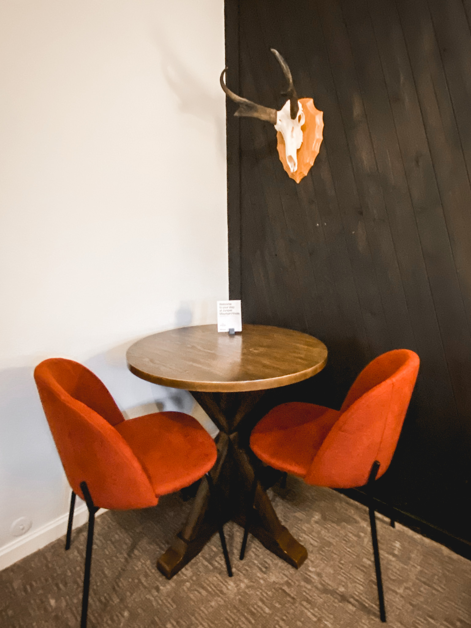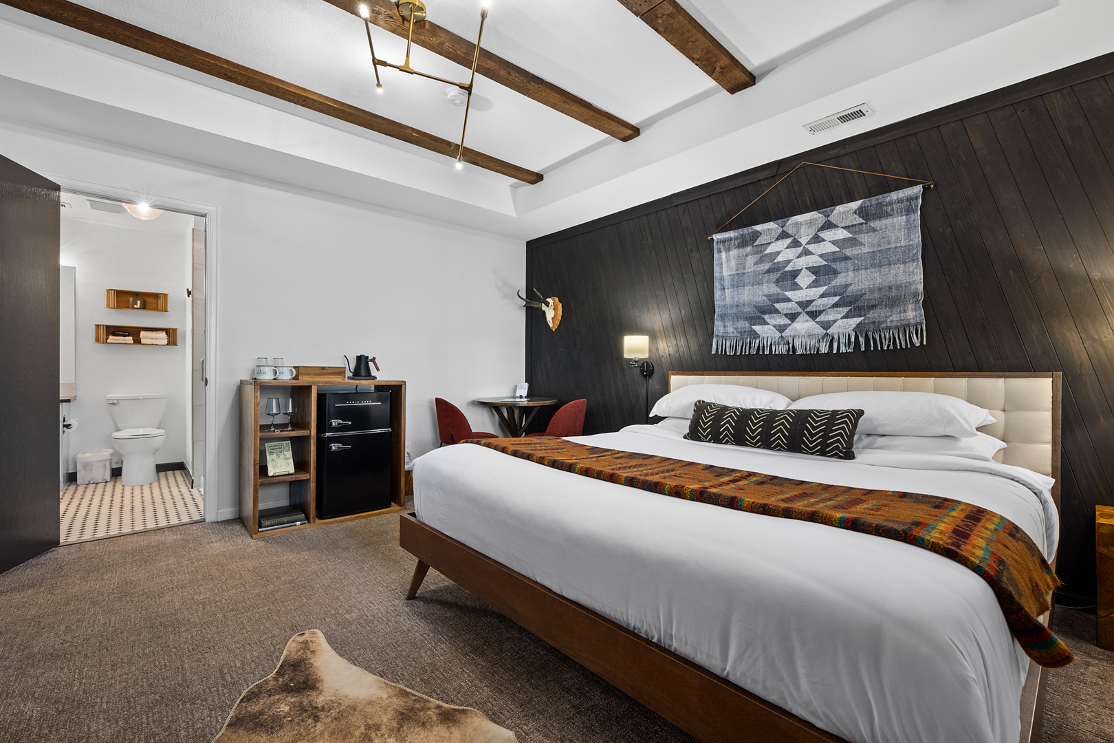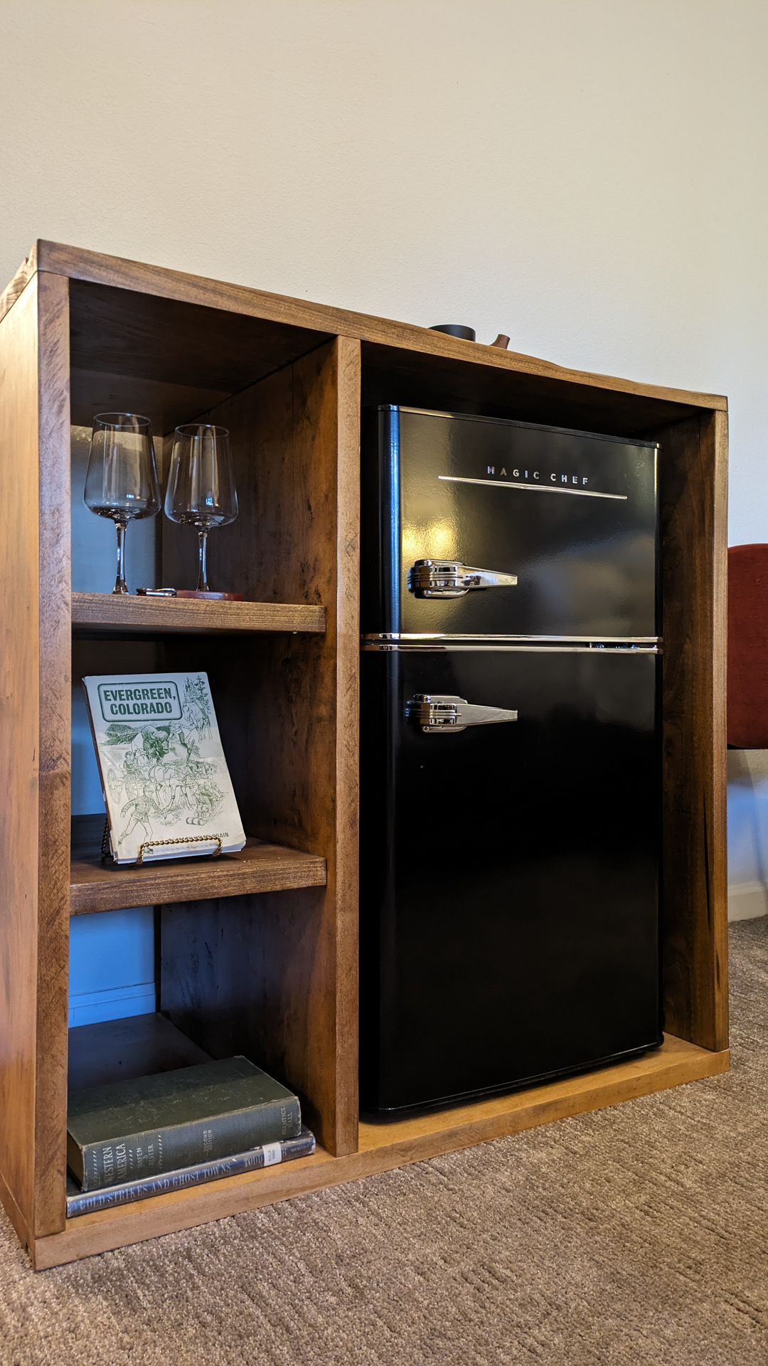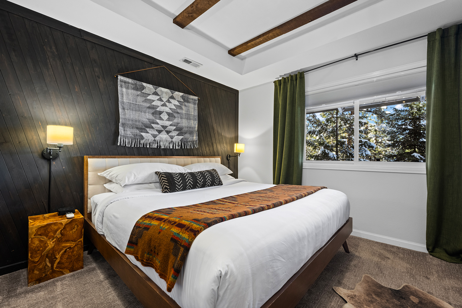 True to its name, this room offers mountain, evergreen and deck views. Conveniently situated on the lower level, this room provides easy access to the fire pit, hot tub, and lounge, offering a more accessible option compared to the upper-level rooms with minimal stairs to navigate. The room itself boasts a plush king bed with soft pillows, inviting seating areas, and is perfectly suited for extended stays, featuring a cozy sofa, a bistro table, and a retro mini fridge. Despite occasional noise due to the room’s proximity to common areas, our little property is generally very quiet.