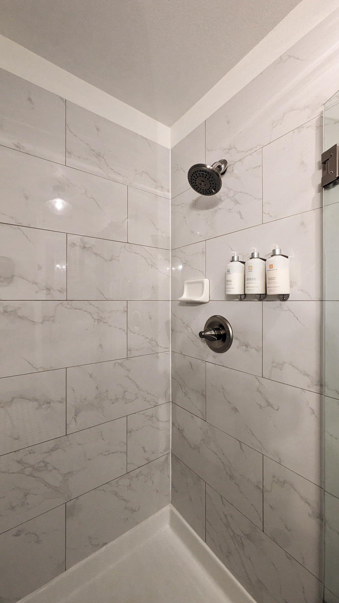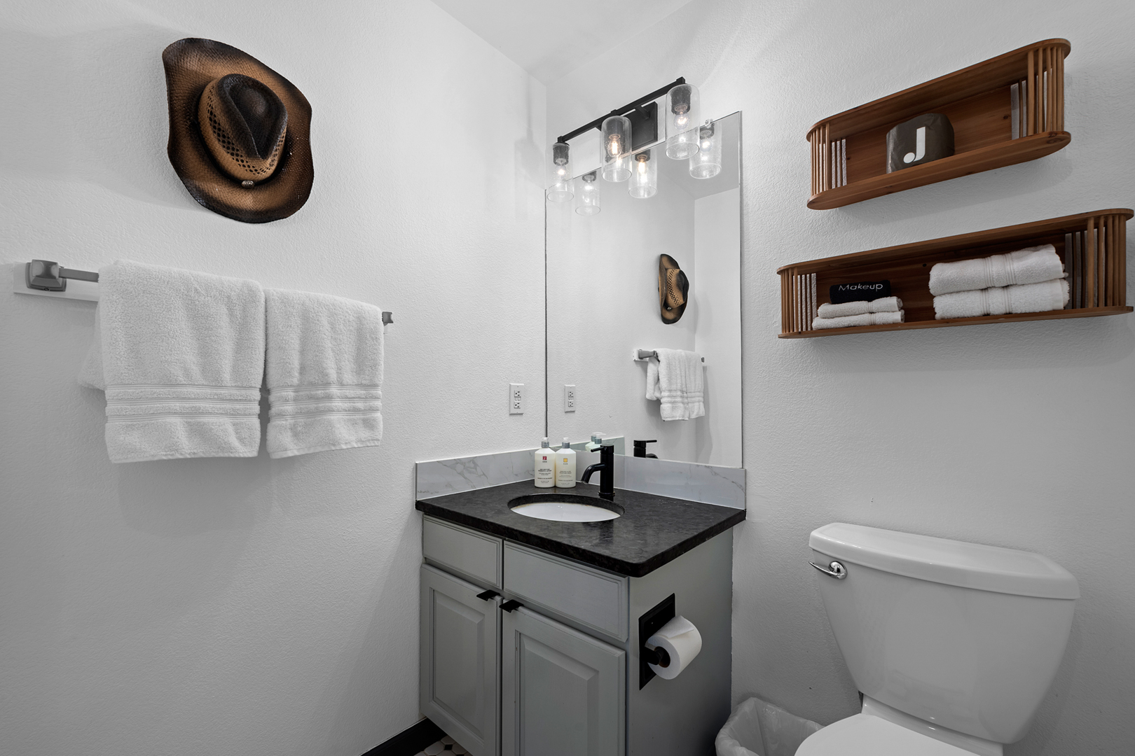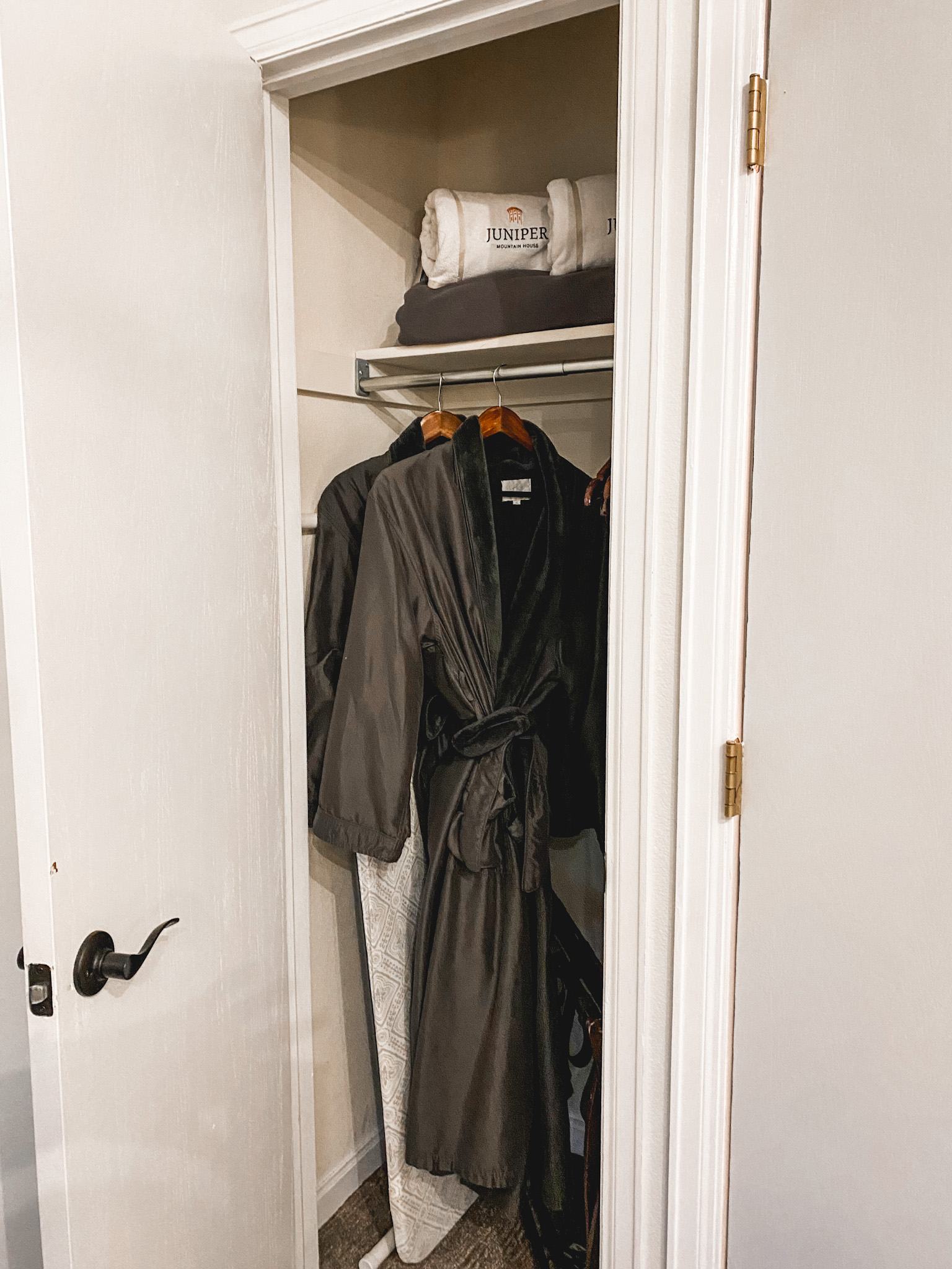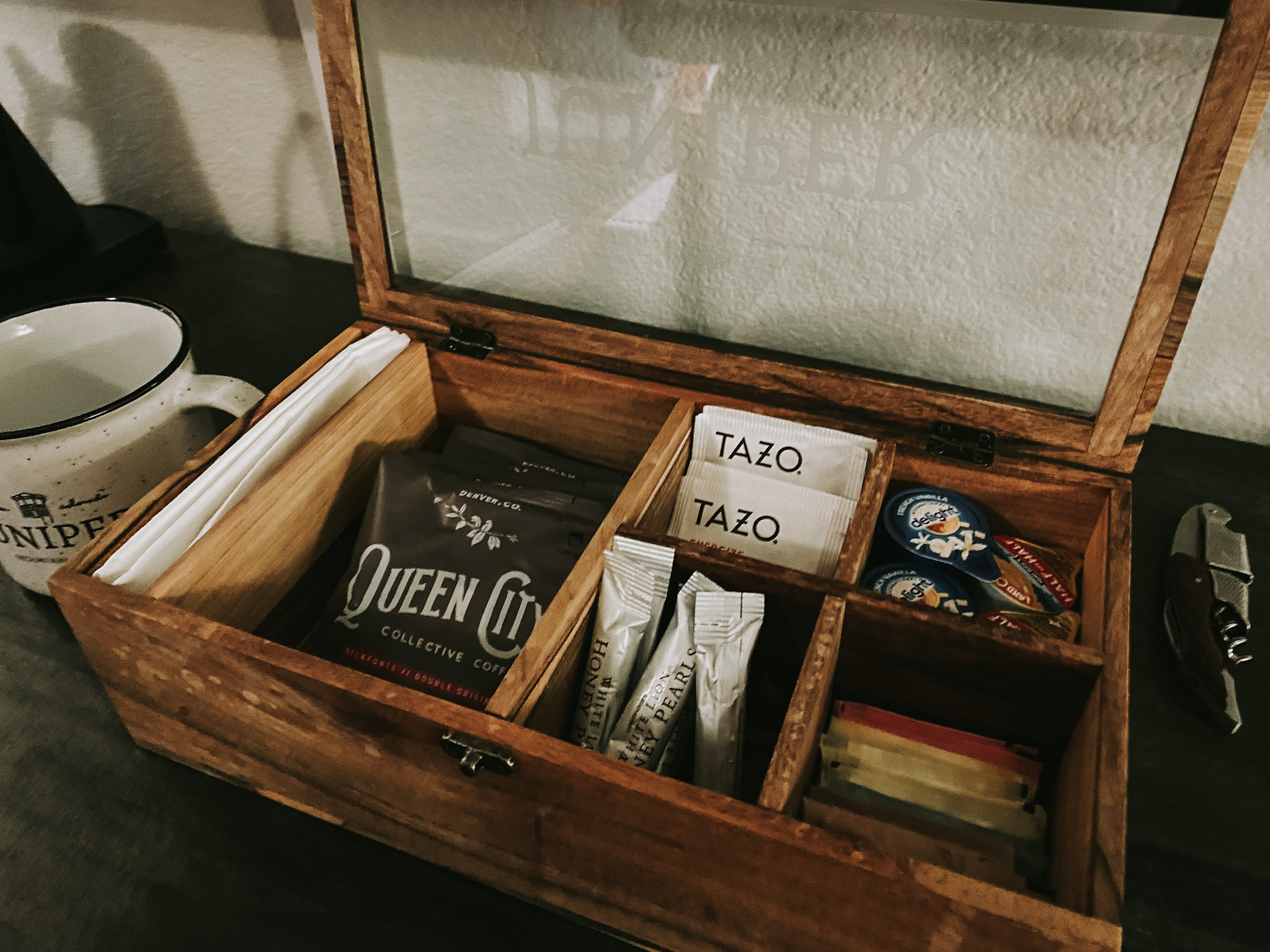 True to its name, this room offers mountain, evergreen and deck views. Conveniently situated on the lower level, this room provides easy access to the fire pit, hot tub, and lounge, offering a more accessible option compared to the upper-level rooms with minimal stairs to navigate. The room itself boasts a plush king bed with soft pillows, inviting seating areas, and is perfectly suited for extended stays, featuring a cozy sofa, a bistro table, and a retro mini fridge. Despite occasional noise due to the room’s proximity to common areas, our little property is generally very quiet.