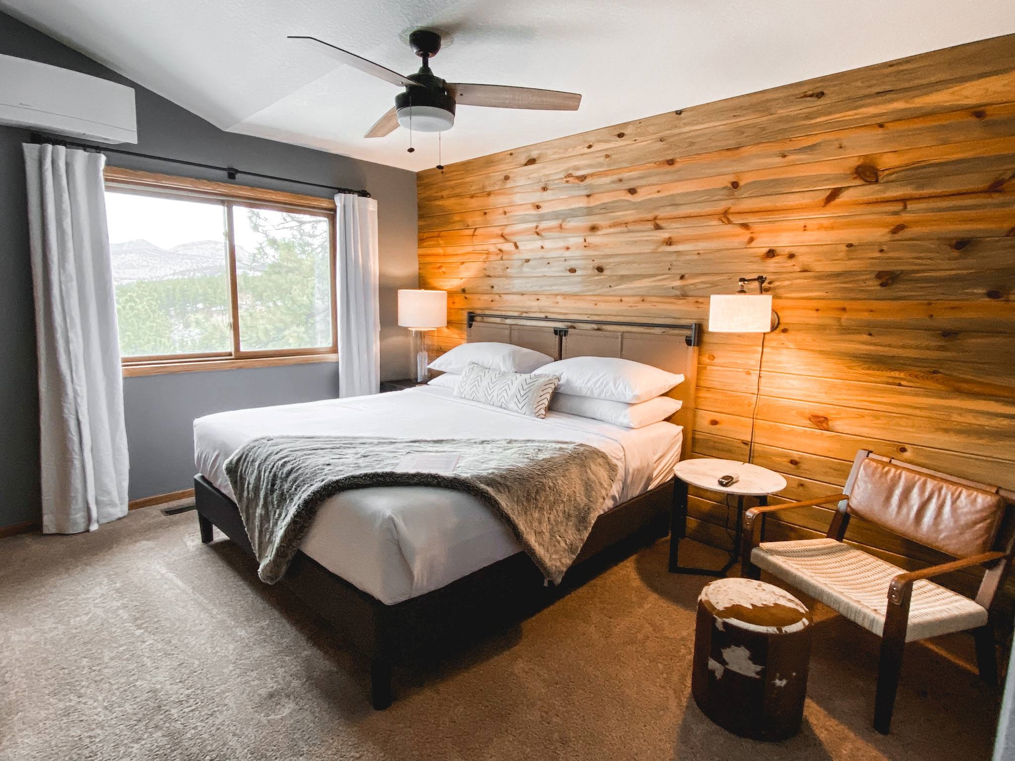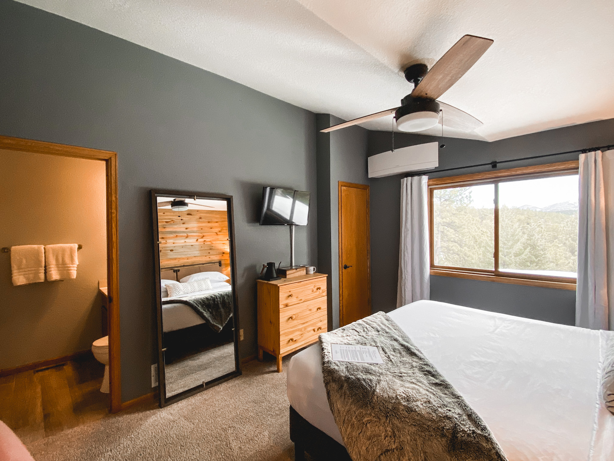 The Spruce King Room has the best mountain views in the lodge, perfect for catching Colorado’s famous golden sunsets. It’s cozy and welcoming, with warm, thoughtful touches that make it feel like home. You’ll sleep soundly on the firm king memory foam bed and enjoy a comfy seating area to kick back and relax. The large window brings in fresh mountain air and plenty of natural light, creating a space that’s both peaceful and inviting.
